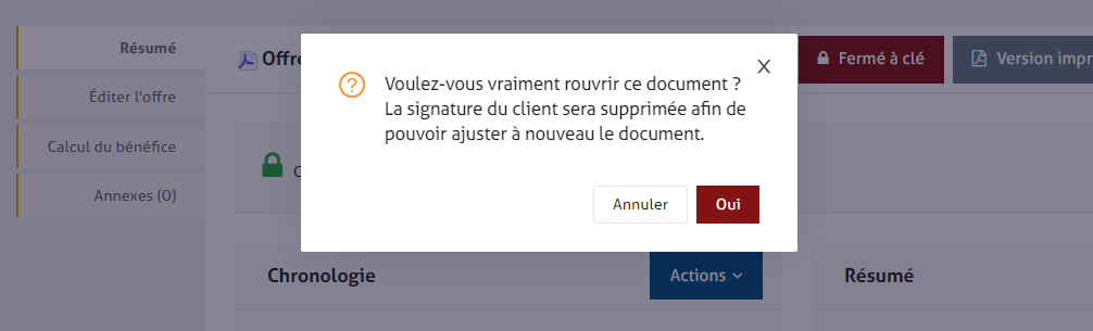 Toutefois, en cliquant sur le cadenas, vous pouvez à nouveau déverrouiller le document. Le statut du document reste "Accepté", mais la signature du client est supprimée. Il faut donc y prêter une attention particulière !