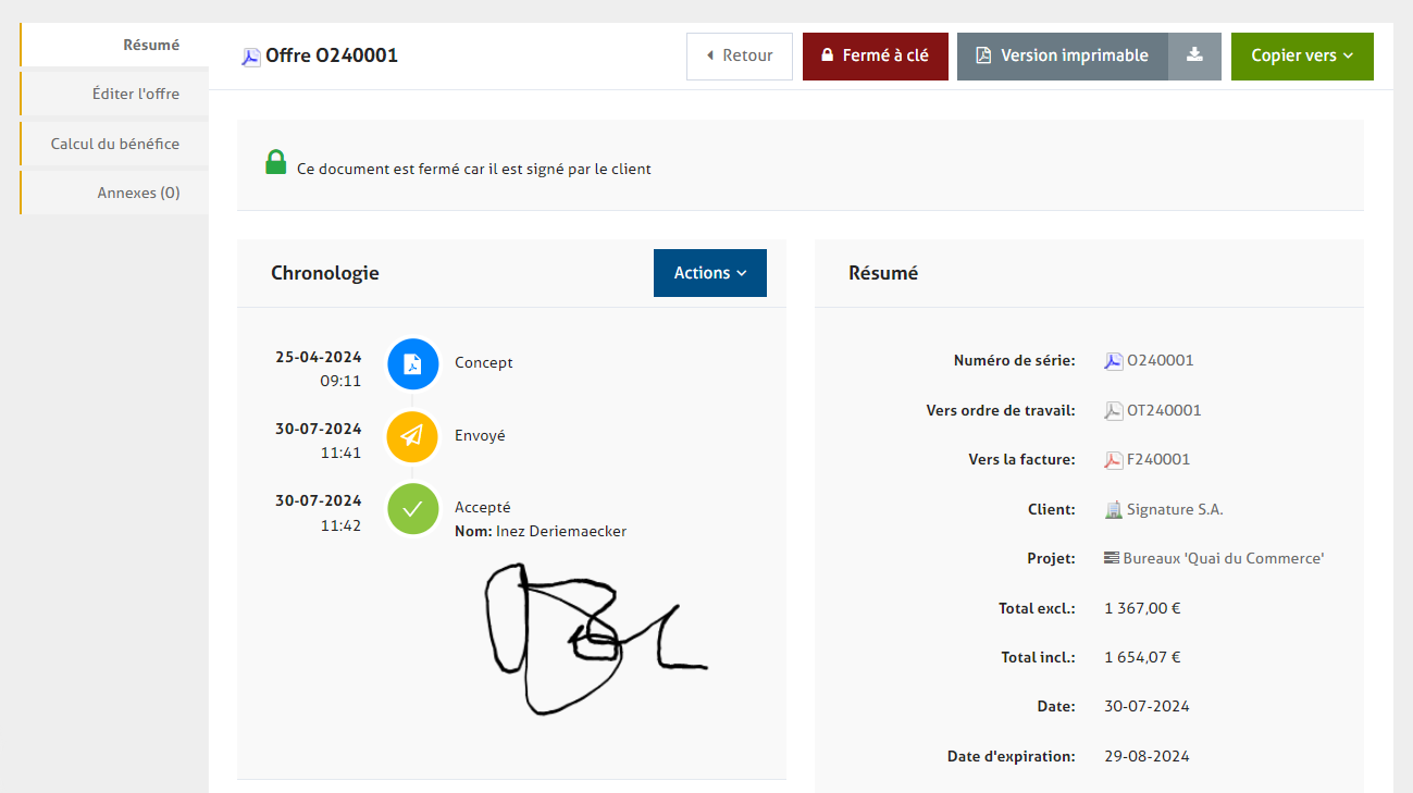 Une fois que le client a accepté l'offre en signant en ligne, vous ne pouvez plus le modifier (voir le symbole du cadenas).