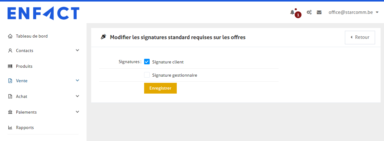 Après la signature, enFact change automatiquement le statut de l'offre en "Accepté". Vous serez également informé par e-mail de la signature/acceptation.&#x20;