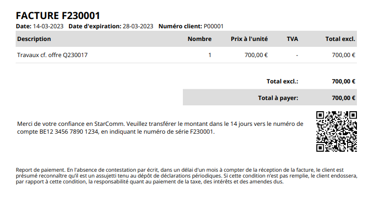 Permettez à vos clients de payer facilement en proposant sur vos factures un code QR qui peut être scanné à l'aide d'une application mobile. Ce code QR remplit automatiquement tous les champs d'un virement bancaire lorsqu'il est scanné. Votre client ne doit donc plus retaper les détails du paiement : vous évitez ainsi les erreurs d'encodage et vous êtes payé rapidement.&#x20;