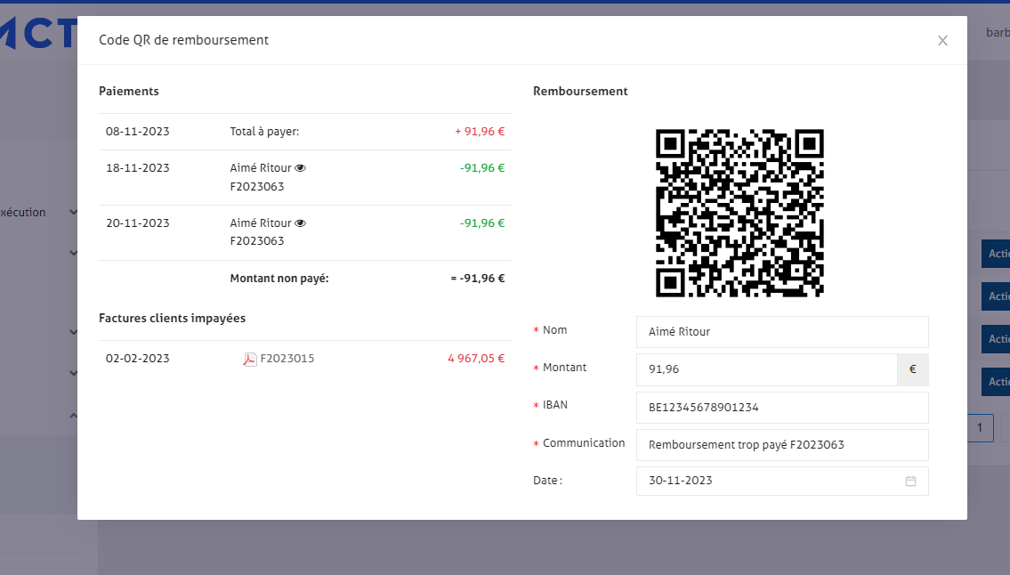 Sur le côté droit, enFact récupère les données du paiement du client et génère un code QR basé sur les champs à remplir. Vous pouvez le scanner immédiatement avec votre application bancaire pour effectuer le remboursement.
