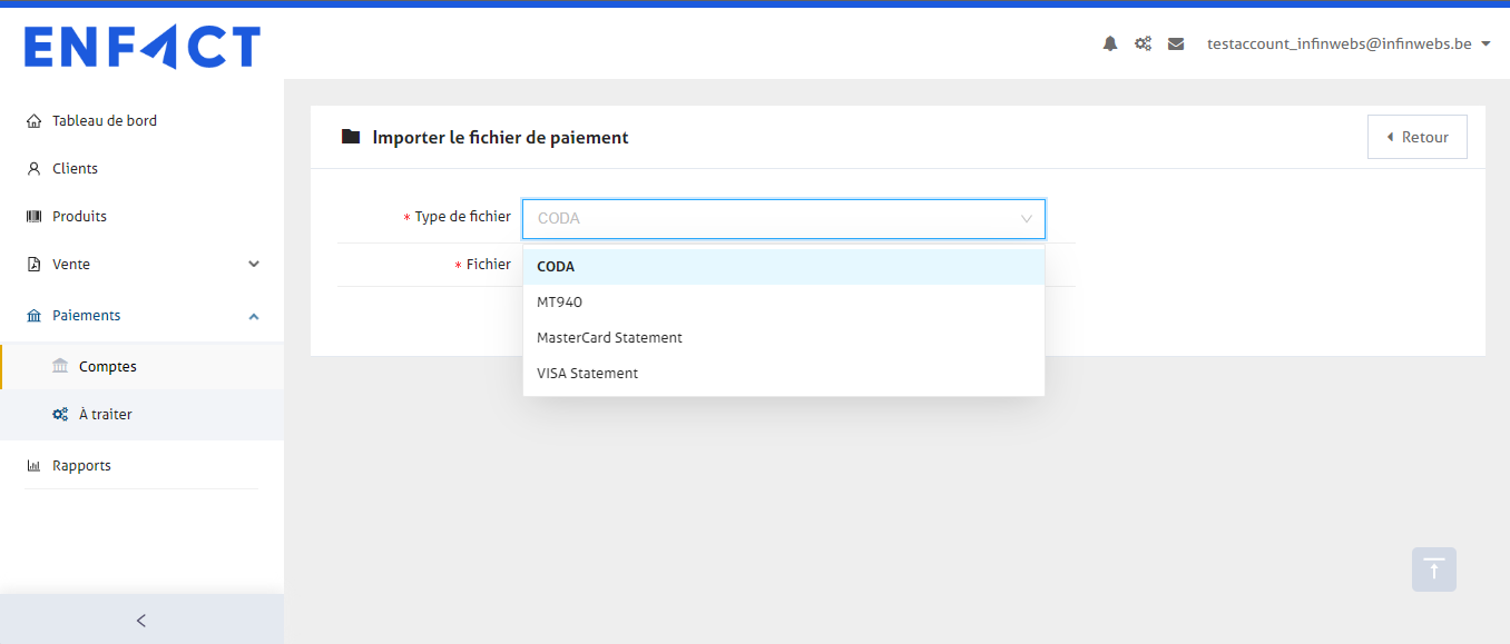 Veuillez noter que enFact ne peut pas identifier les paiements que vous avez déjà téléchargés et ceux que vous n'avez pas téléchargés. Vous devez garder un œil sur ce point pour éviter que les paiements n'apparaissent deux fois dans enFact.