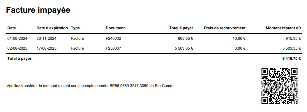 Dans l’aperçu PDF, un code QR est également inclus par défaut pour permettre le paiement du montant non payé. Exemple :&#x20;