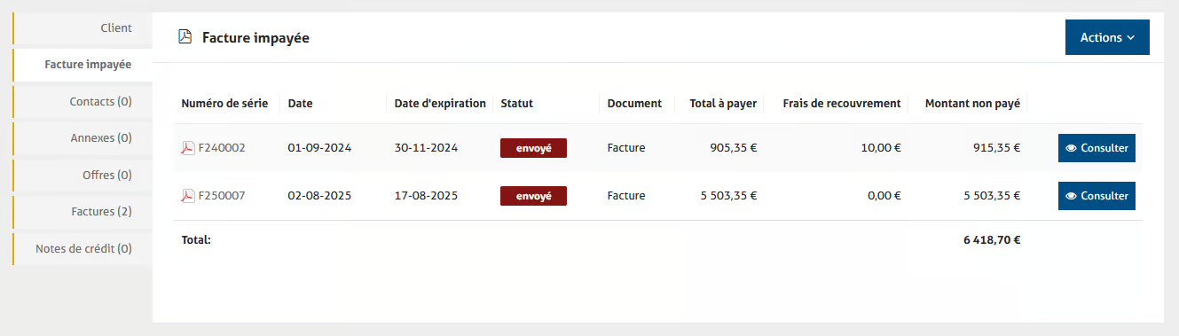 Depuis une fiche client, vous pouvez également consulter ou créer une facture impayée à envoyer à votre client. Pour cela, cliquez sur l’onglet 'Facture impayée'.