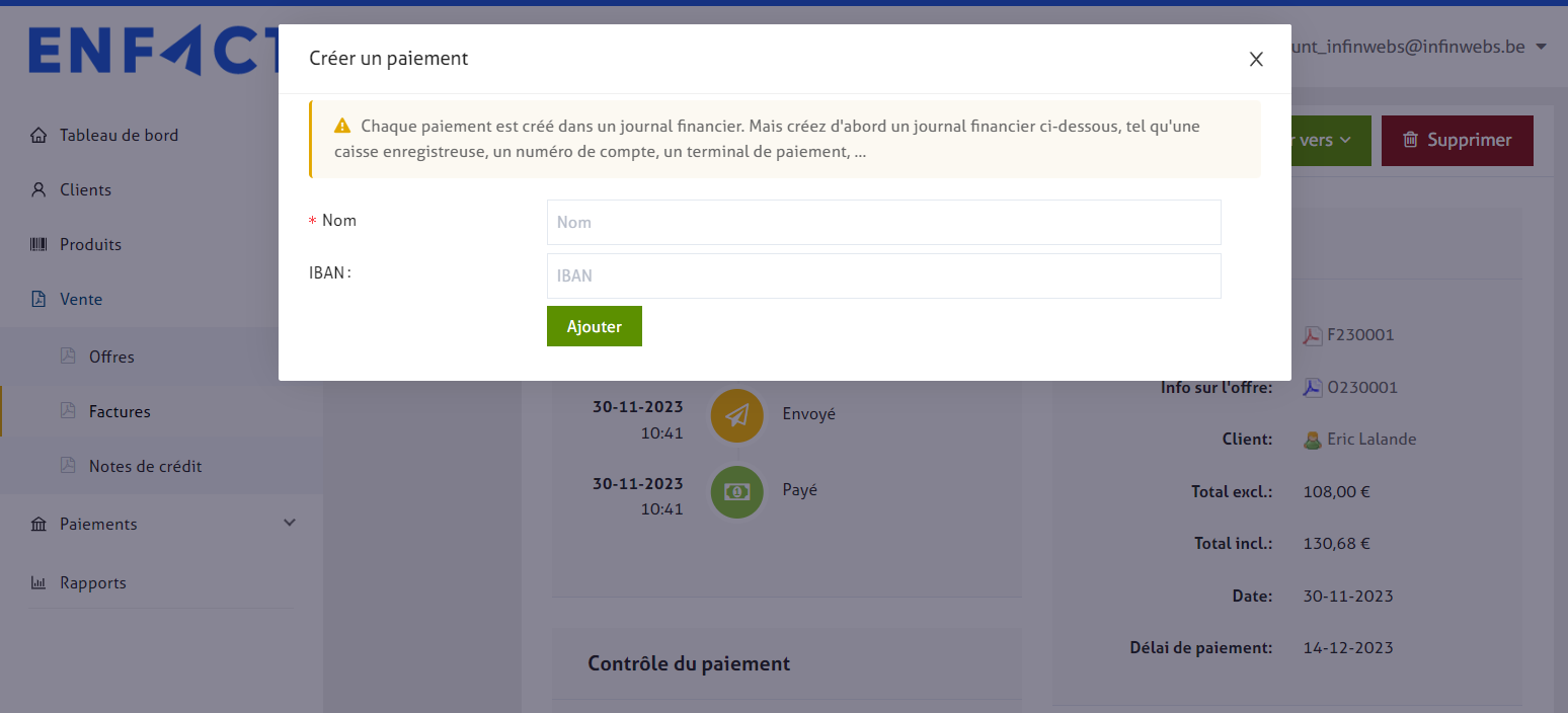Une fenêtre contextuelle s'ouvre pour créer un compte de paiement : il s'agit du compte désigné où ce paiement sera subdivisé dans enFact. Par exemple, pour les encaissements, ce compte peut être appelé "caisse", vous pouvez également créer un "compte à vue" ici, ...