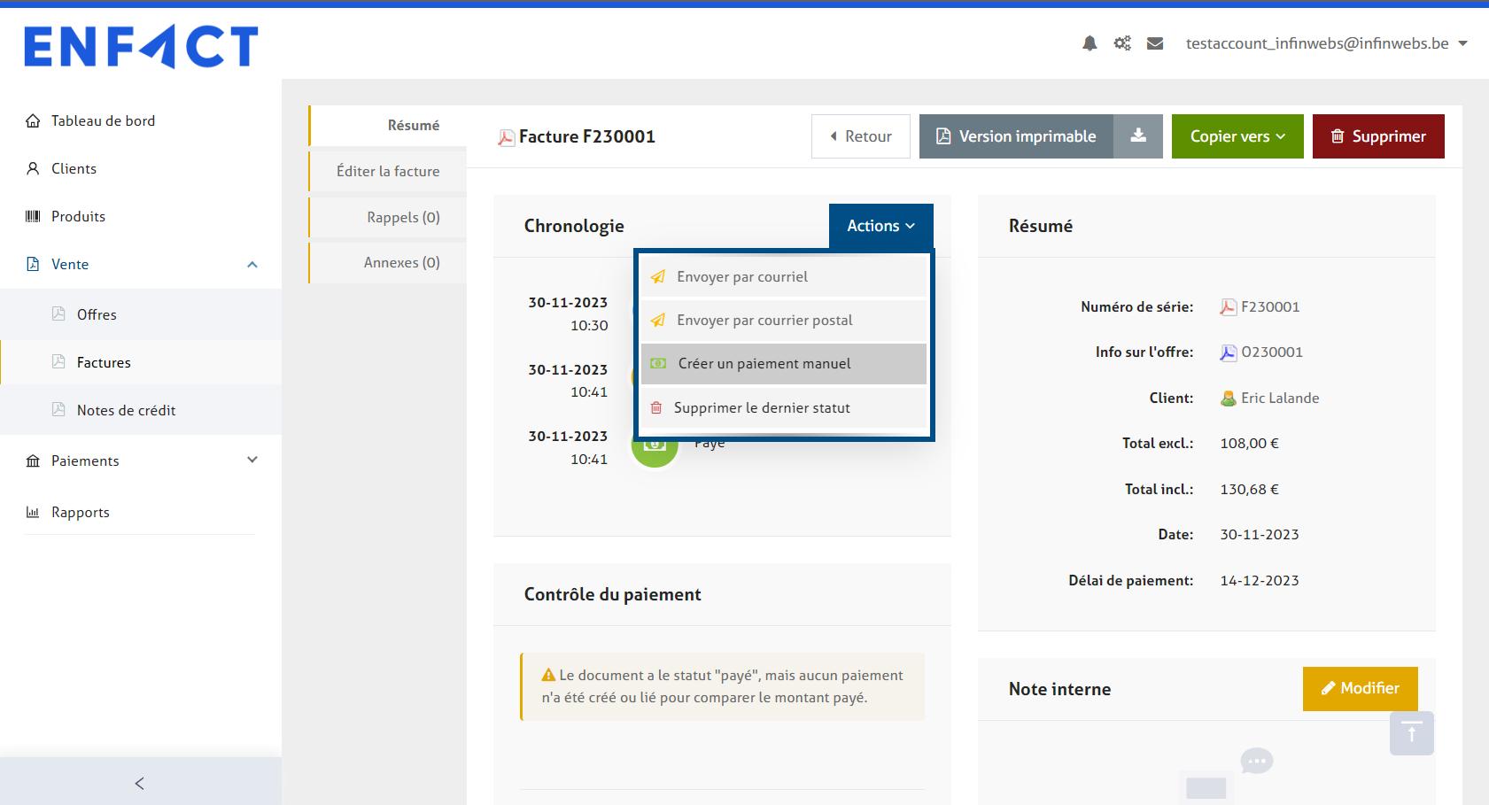 Pour marquer votre facture comme "payé", cliquez sur le bouton "Changer le statut à 'payé'" dans le résumé de la facture.