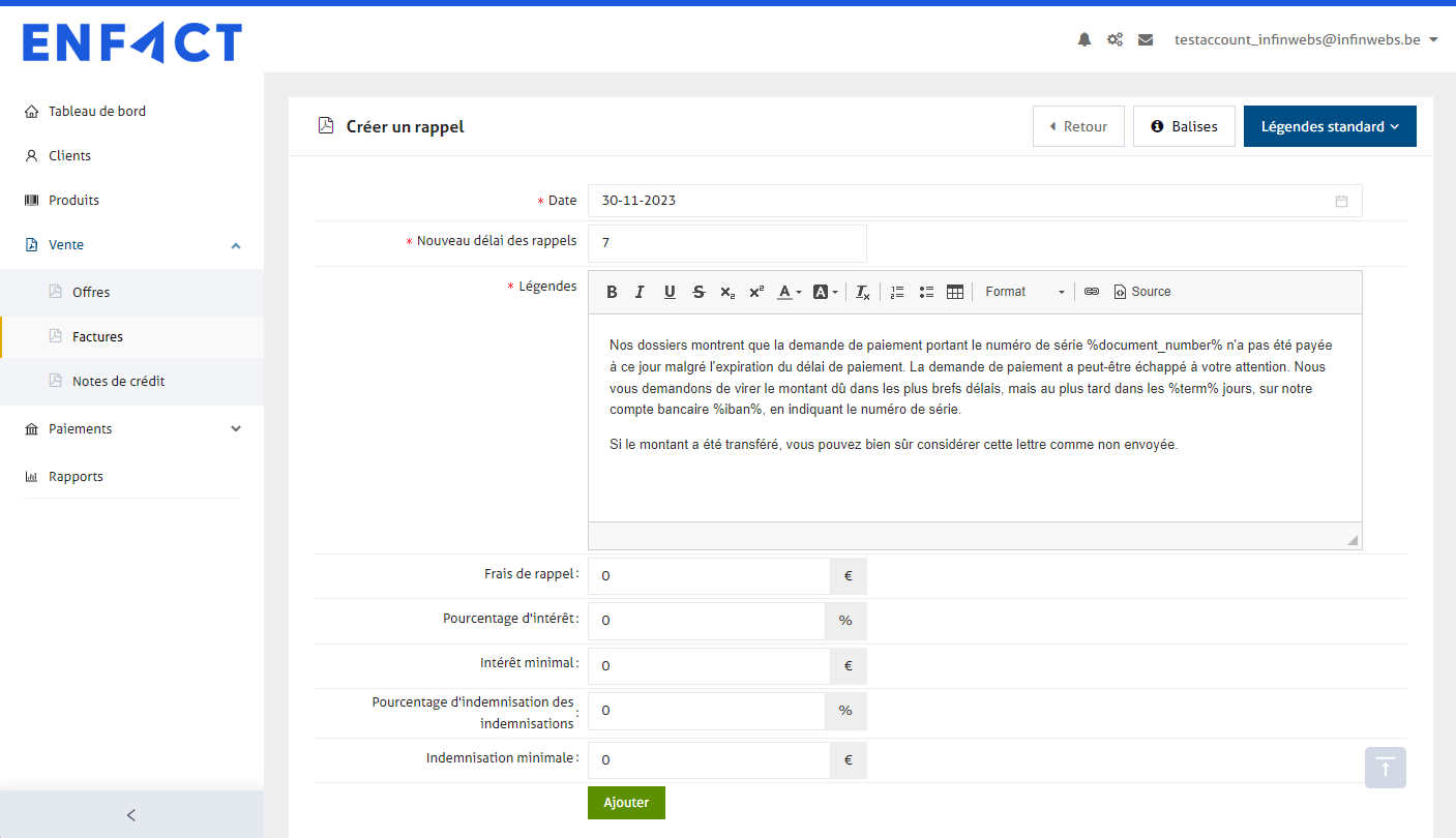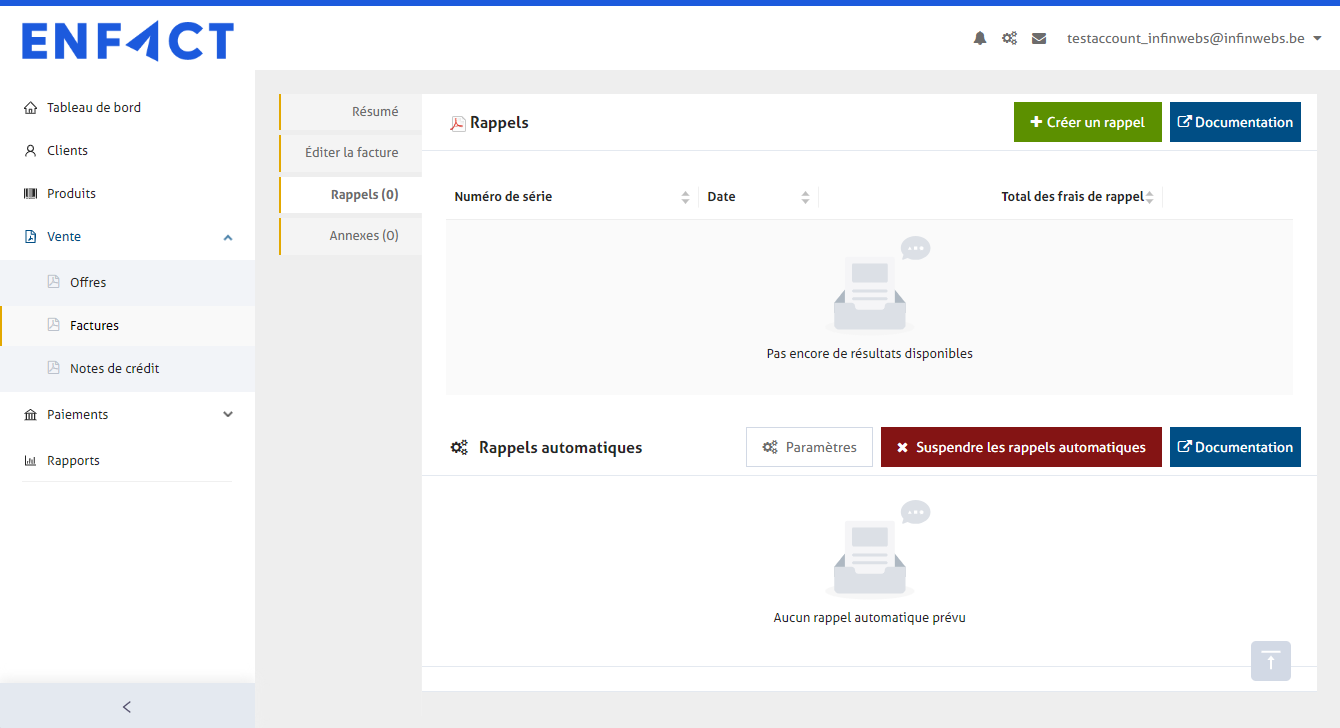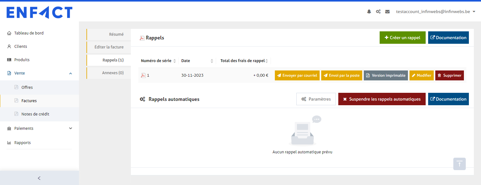 Vous pouvez immédiatement configurer un ou plusieurs rappels de paiement automatiques pour tous vos paiements au niveau de l'entreprise. Lisez le tutoriel sur les "[rappels automatiques](https://support.enfact.be/parametres/des-rappels-automatiques)" ici.