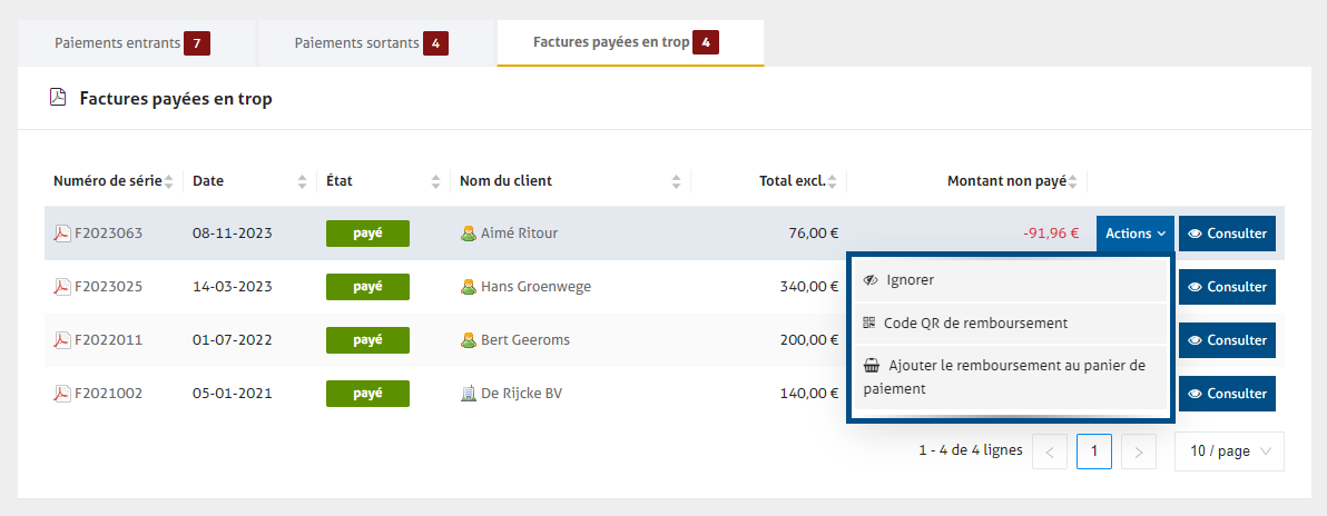 Dans cette liste, vous trouverez un aperçu des factures payées en trop. Vous pouvez facilement les rembourser au client à partir d'ici.