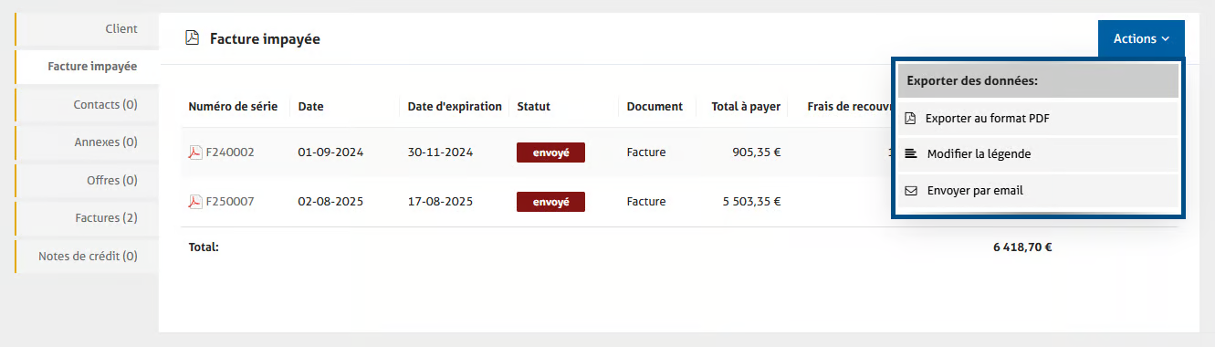 Via le bouton bleu 'Actions' en haut de la page à droite, vous pouvez exporter ce récapitulatif en PDF, modifier la légende éventuelle de ce document et envoyer ce fichier PDF directement à votre client.