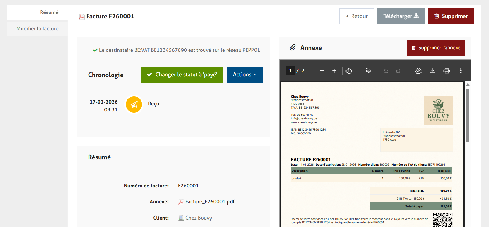 Une fois le document enregistré, vous arrivez dans la fenêtre de résumé. À cet endroit-ci, vous pouvez marquer la facture comme payée.