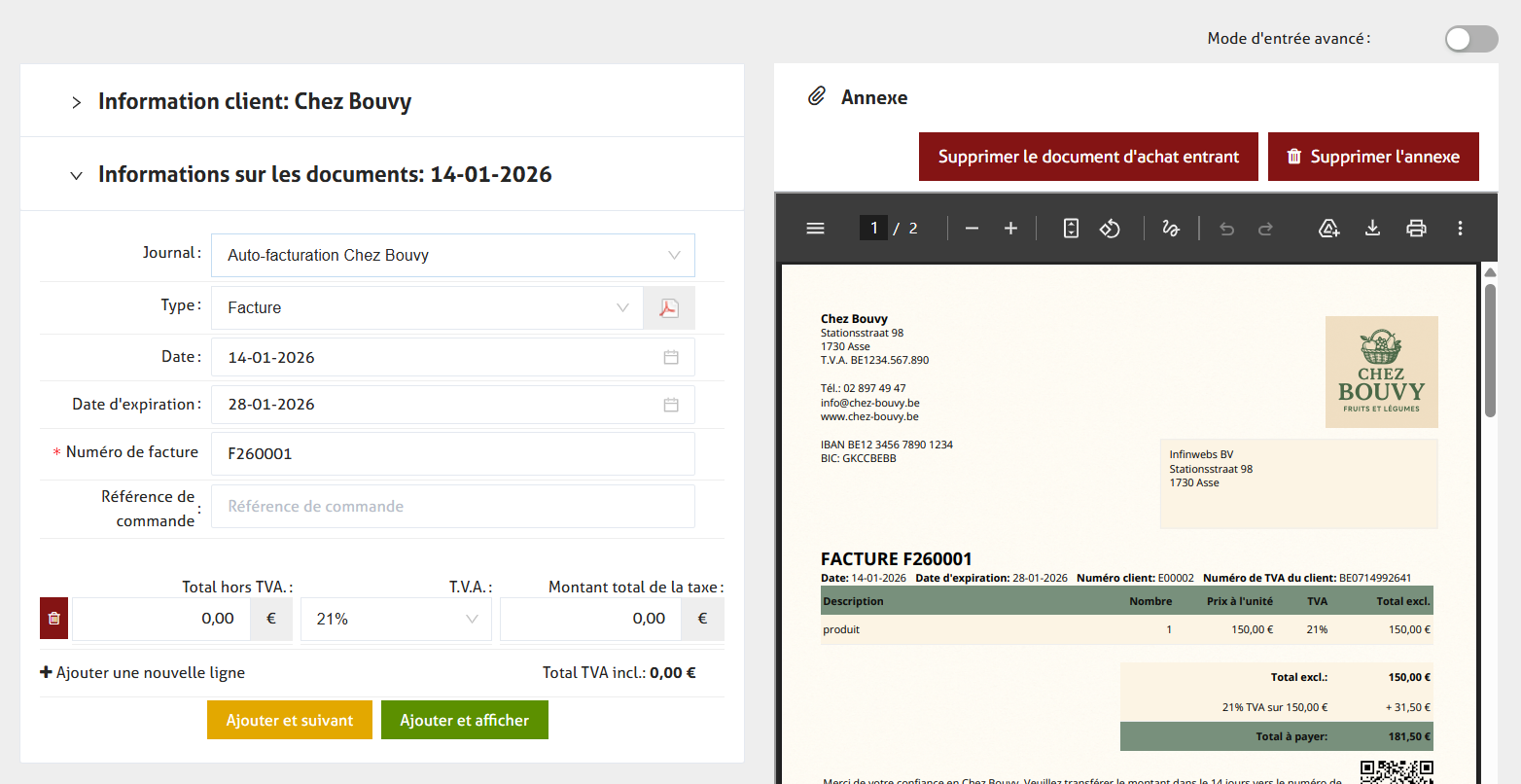 Cliquez en dessous sur l’un des boutons pour sauvegarder la facture de self-billing dans enFact.