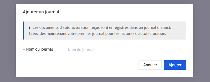 Lorsqu’un document d'auto-facturation est traité dans enFact, il est enregistré dans un journal de vente distinct. Depuis ce journal, vous pourrez également transmettre ces documents à votre comptable. Lors du premier traitement d’un document d'auto-facturation, vous pouvez définir le nom du journal choisi.