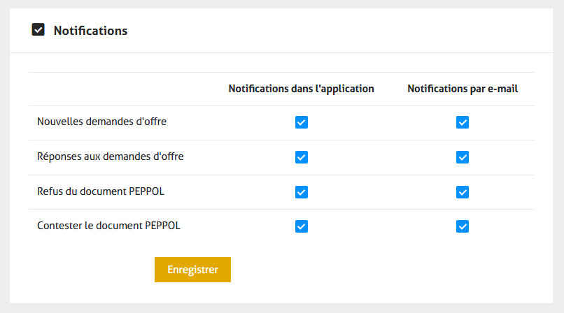 En fonction des modules que vous avez activés dans enFact via « Applications et connexions », vous verrez plus ou moins d’options ici. Par défaut, toutes les notifications disponibles sont activées : décochez celles que vous ne souhaitez plus recevoir et enregistrez.